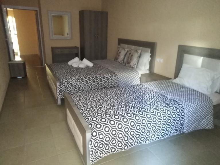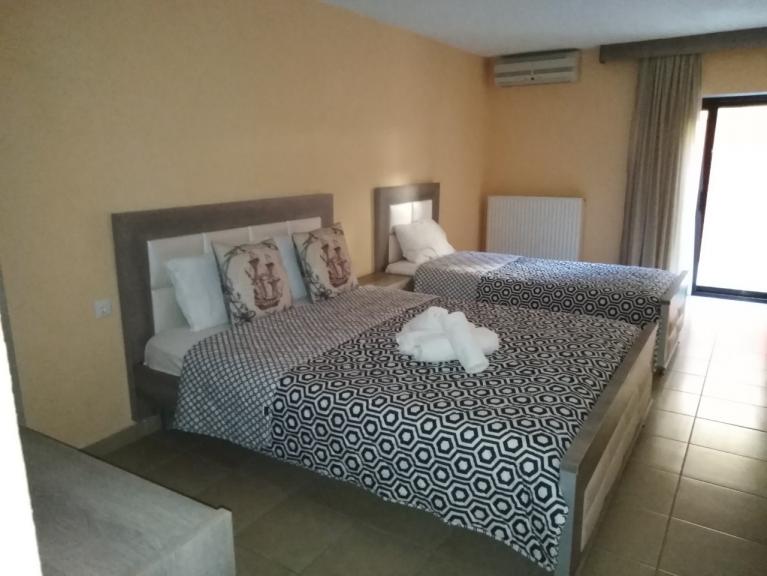 The Grigoris Apartment House is located in New Sarti, just a few steps from the sandy beach and approximately 600 meters from the center of Sarti. All essential services such as supermarkets, tavernas, and souvenir shops are within easy reach, making it an ideal choice for a comfortable and relaxing holiday. The wide, gently sloping beach is especially suitable for families, and the close proximity to the sea is a great advantage for guests with children. The house offers a ground-floor one-bedroom apartment with living area for up to 4 guests, as well as a first-floor apartment accommodating 4–5 guests. Both apartments feature spacious layouts, large balconies, and interconnected rooms, providing a quiet and comfortable stay for families.