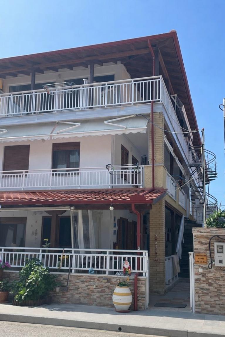 Haus Maria consists of 10 triple rooms and 2 rooms for 4 or 5 people.Each room is equipped with bathroom,balcony,small kitchen,refrigerator,satellite tv,wi-fi and air conditioning.Haus Maria is only 60m far from the beach of Sarti,which is ideal for families with children but also the more active guests can choose between every kind of water activity. Awarded the Blue Flag for many years.