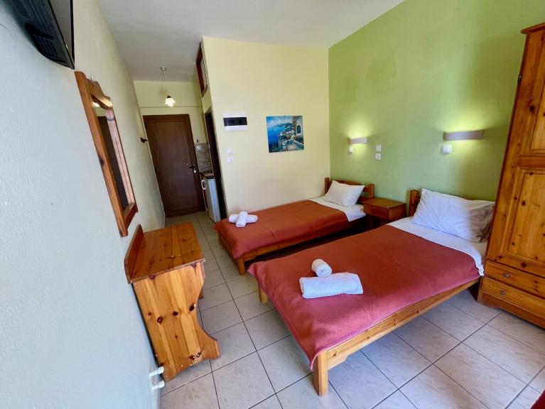 Located in Sarti. Very close to the center you find all the taverns, the restaurants, the cafeterias and supermarkets. The beach is only 50 meters away. It consist of 2-3 beds studios and 4-5 beds apartments. Suggested fo all ages. Young couples, old couples , families with children as well. From the sea view balcony you can enjoy the view of the Holy Mount Athos. Good choice if you want to spend a peaceful and eventful holiday.